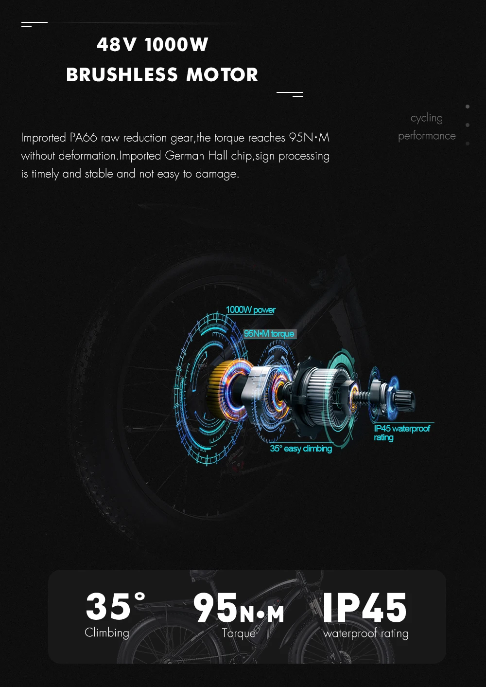 Powerful 2000W Brushless Motor: Provides strong rear-hub drive for smooth acceleration and hill-climbing capability, reaching speeds up to 43km/h.